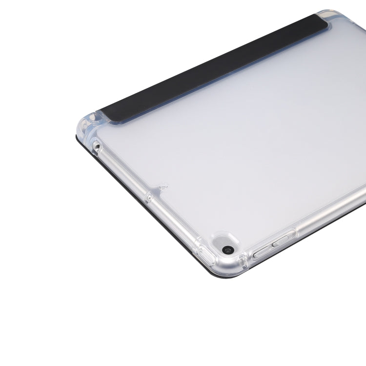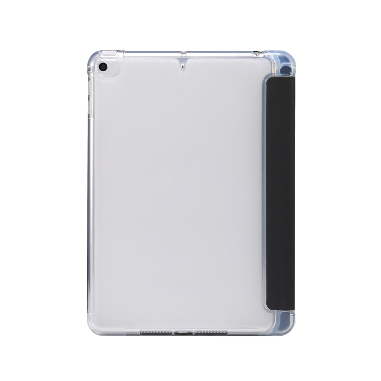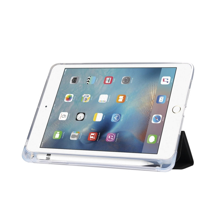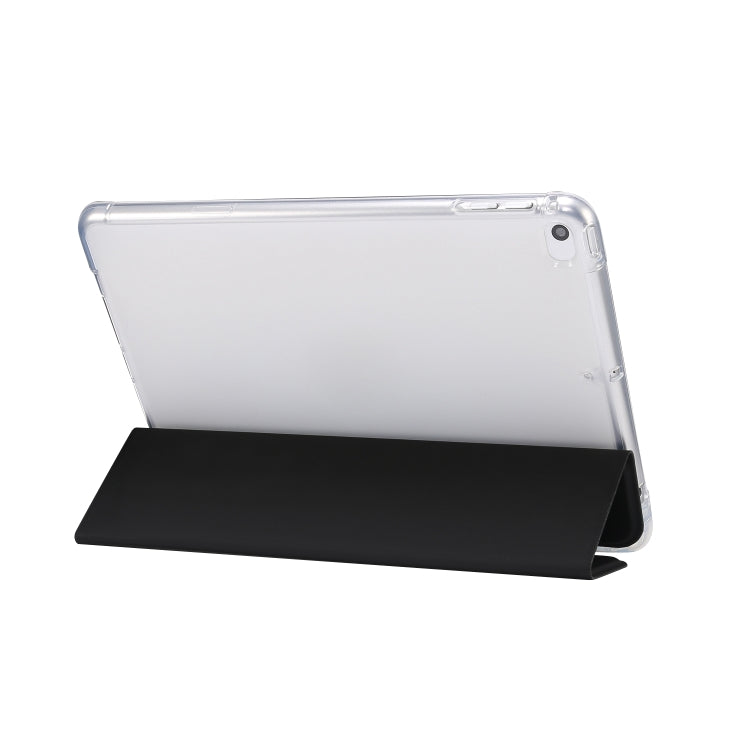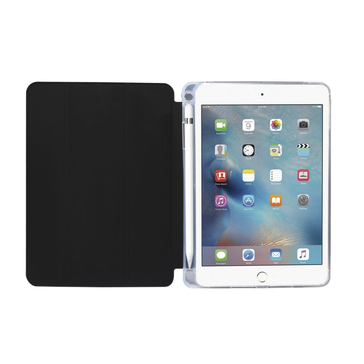 For iPad mini (2019) / mini 4 3-folding Electric Pressed Skin Texture Horizontal Flip Shockproof Transparent TPU + PU Leather Case with Holder & Pen Slot & Sleep / Wake-up Function(Black)