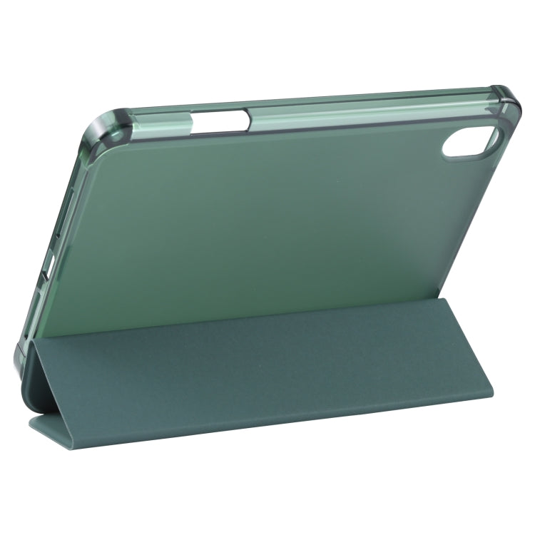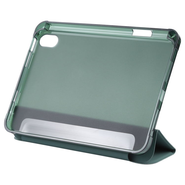 For iPad mini 2024 / mini 6 TPU Transparent Back Cover Horizontal Flip Leather Tablet Case with Three-folding Holder & Pen Slot(Dark Green)