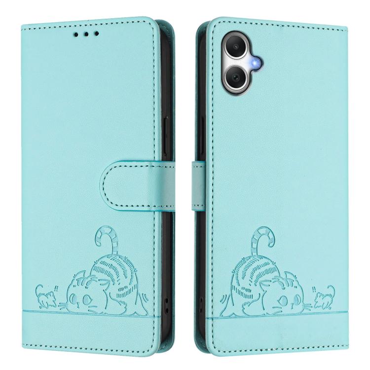 For Samsung Galaxy A06 5G Cat Rat Embossed Pattern RFID Leather Phone Case with Lanyard(Mint Green)