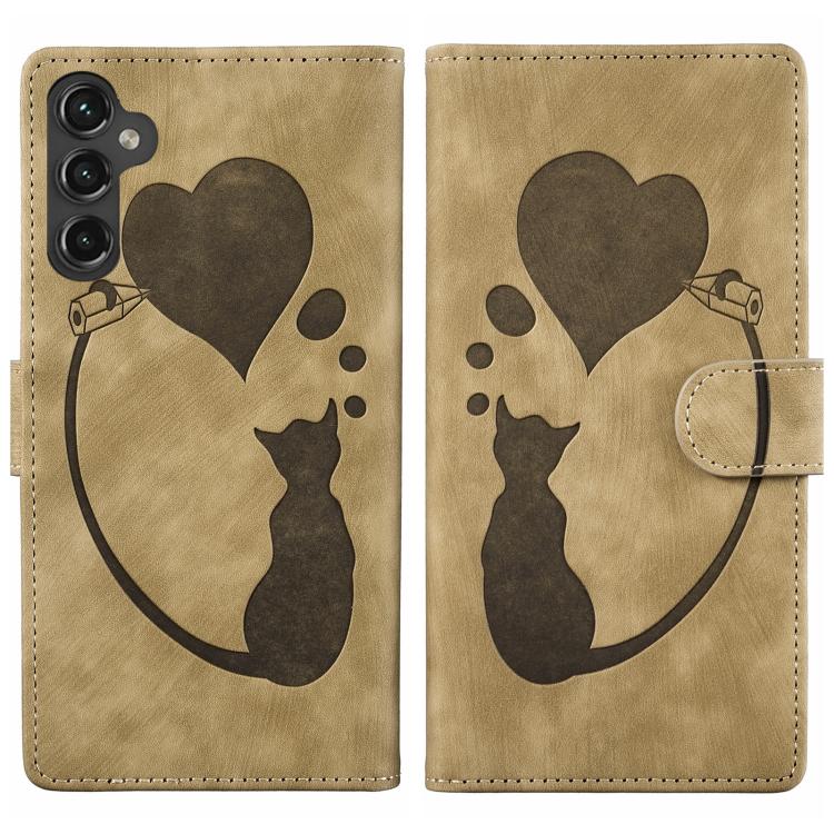 For Samsung Galaxy A36 5G Pen Heart Cat Embossed Leather Phone Case(Apricot)