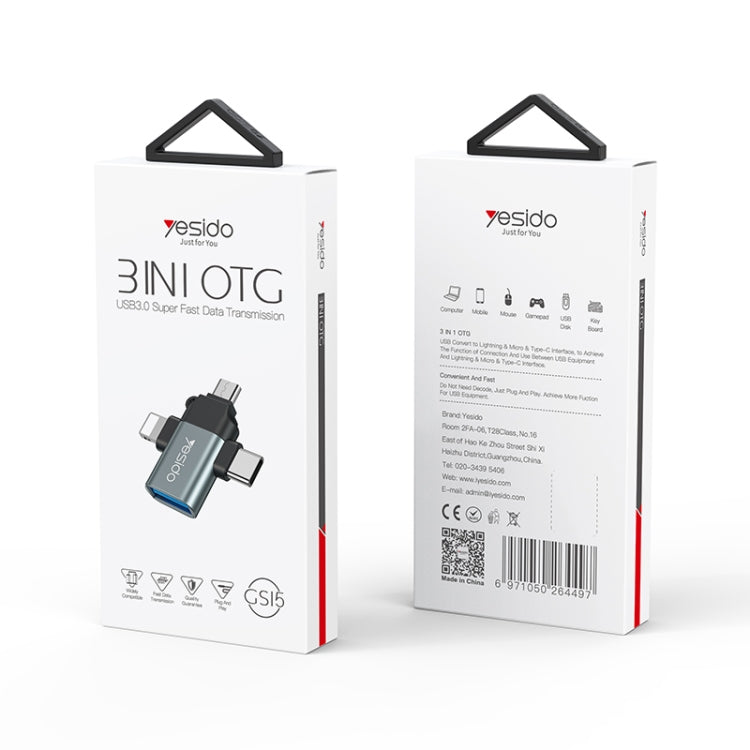 Yesido GS15 3 in 1 USB to USB-C / Type C + Micro USB + 8 Pin OTG Adapter(Black)