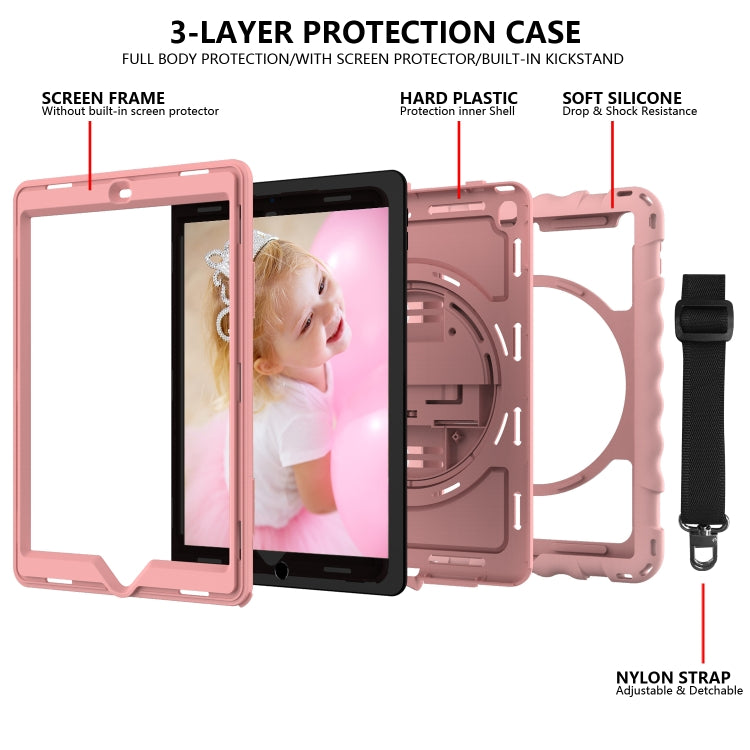 For iPad 9.7 (2018) & (2017) 360 Degree Rotation PC + Silicone Shockproof Combination Case with Holder & Hand Grip Strap & Neck Strap(Rose Gold)
