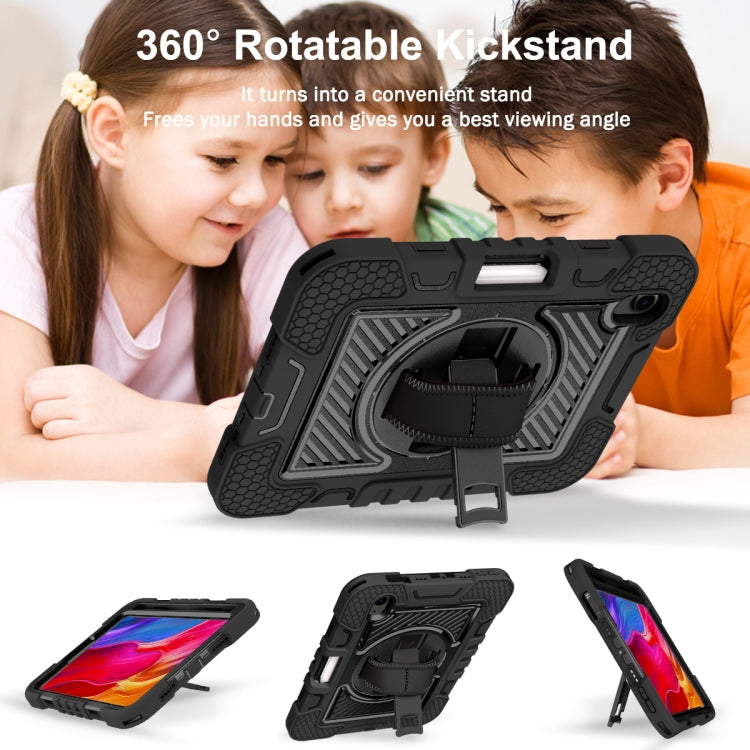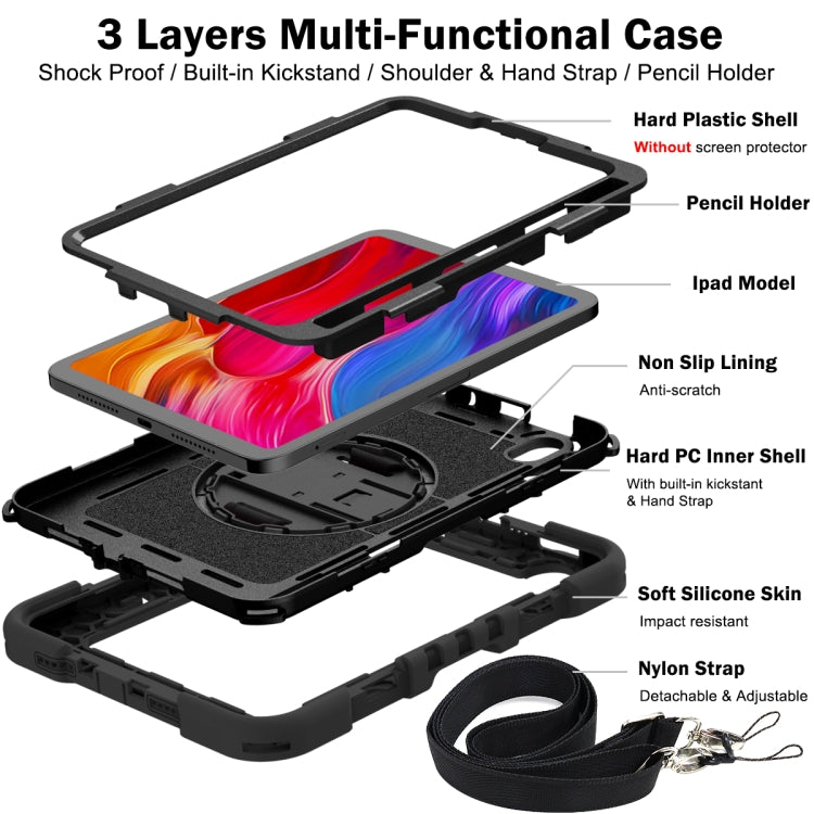 For iPad mini 2024 / mini 6 360 Degree Rotation Contrast Color Shockproof Silicone + PC Tablet Case with Holder & Hand Grip Strap & Shoulder Strap(Black)
