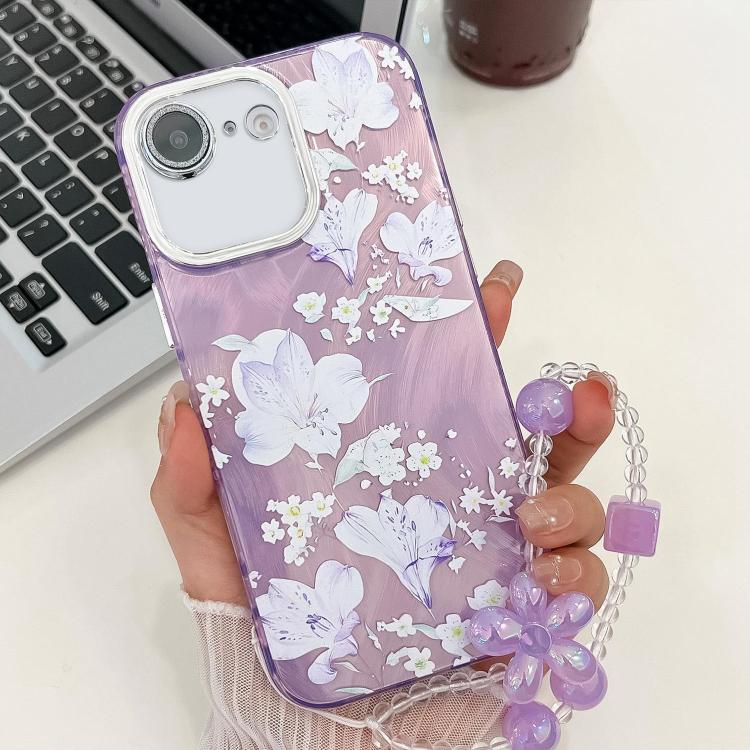 For iPhone 16e Electroplating Flowers Plants Texture Wristband TPU Phone Case(Pale Purple FlowerFL11)
