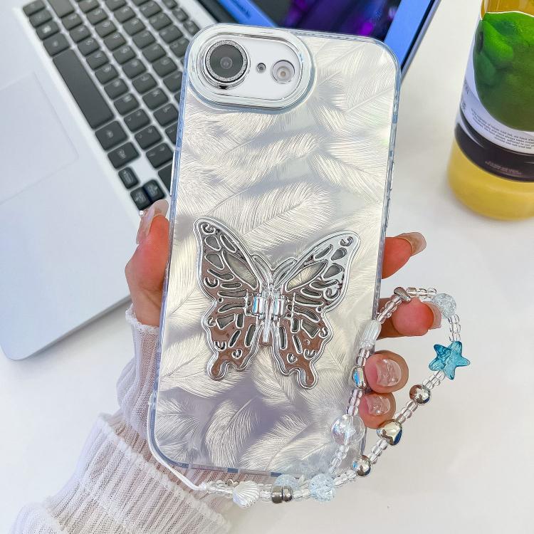 For iPhone 16e Plating Glitter Lens Film Texture Butterfly Holder Wristband Phone Case(White Feathers)