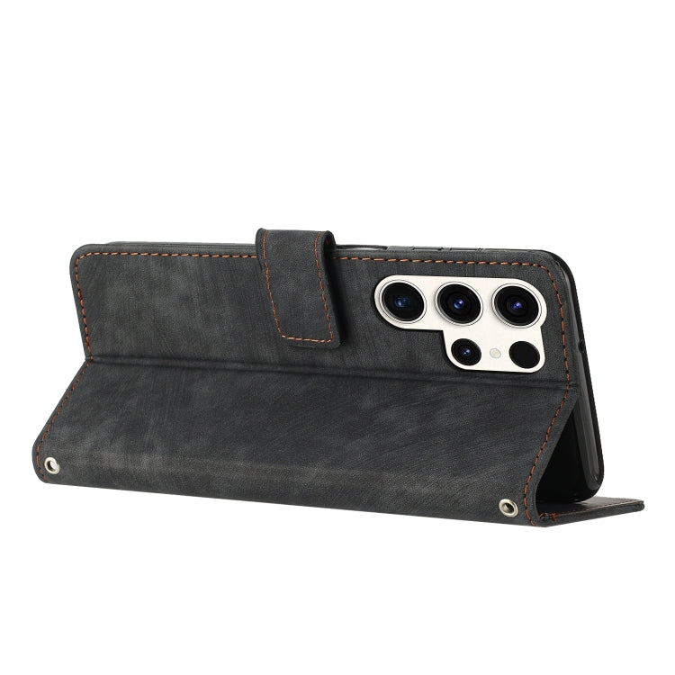 For Samsung Galaxy S25 Ultra 5G Skin Feel Stripe Pattern Leather Phone Case with Lanyard(Black)