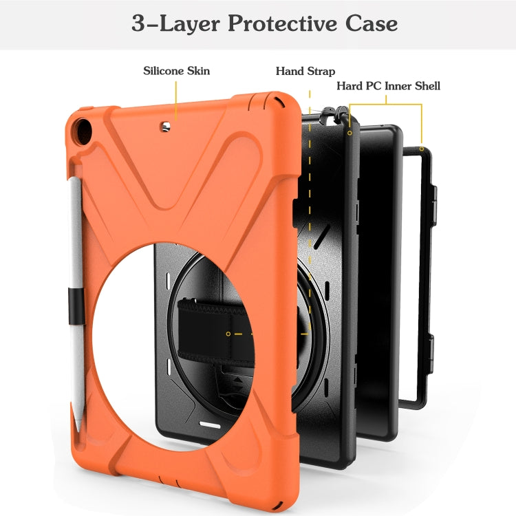 For iPad 9.7 (2018) & (2017) 360 Degree Rotation Silicone Protective Cover with Holder & Hand Strap & Long Strap & Pencil Slot(Orange)