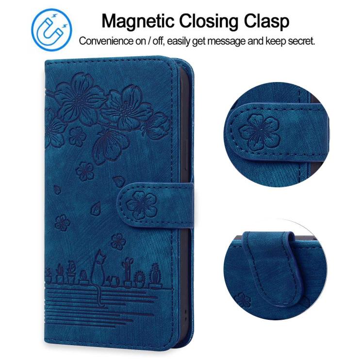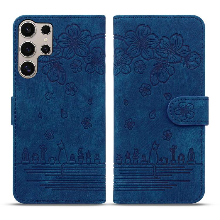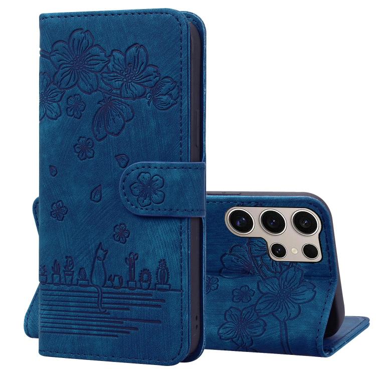 For Samsung Galaxy S25 Ultra 5G Cartoon Sakura Cat Embossed Leather Phone Case(Royal Blue)