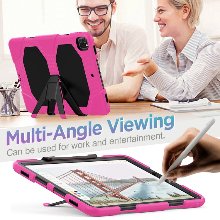 For iPad Pro 12.9 inch (2020) Shockproof Colorful Silicon + PC Protective Tablet Case with Holder & Shoulder Strap & Hand Strap (Rose Red)