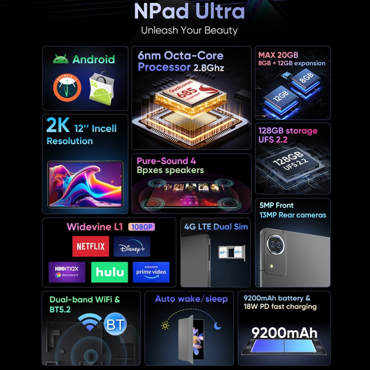 N-ONE Npad Ultra 4G LTE Tablet PC, 8GB+128GB, 12 inch Android 13 Qualcomm Snapdragon 685 Octa Core, US Plug