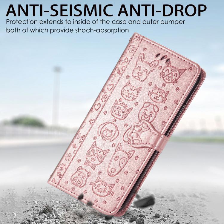 For iPhone 16e Cat and Dog Embossed Leather Phone Case(Rose Gold)