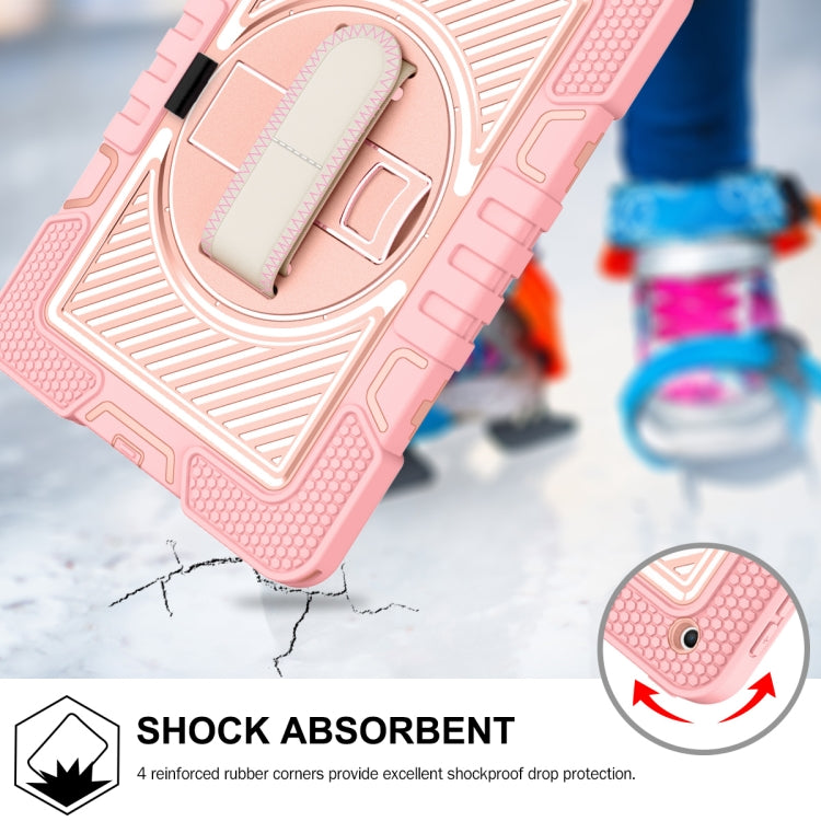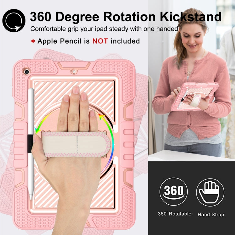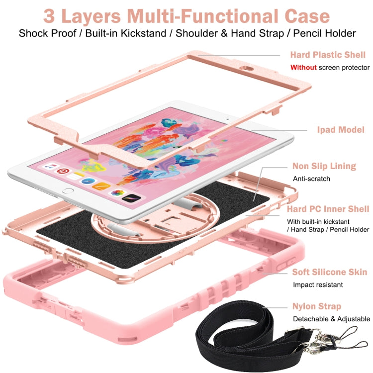 For iPad 9.7 2018 / 2017 360 Degree Rotation Contrast Color Shockproof Silicone + PC Case with Holder & Hand Grip Strap & Shoulder Strap(Rose Gold)