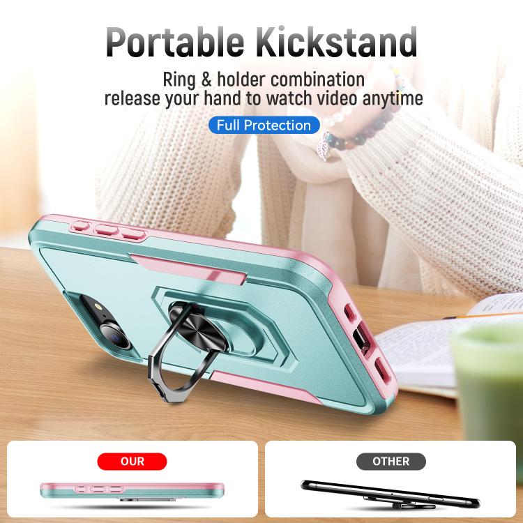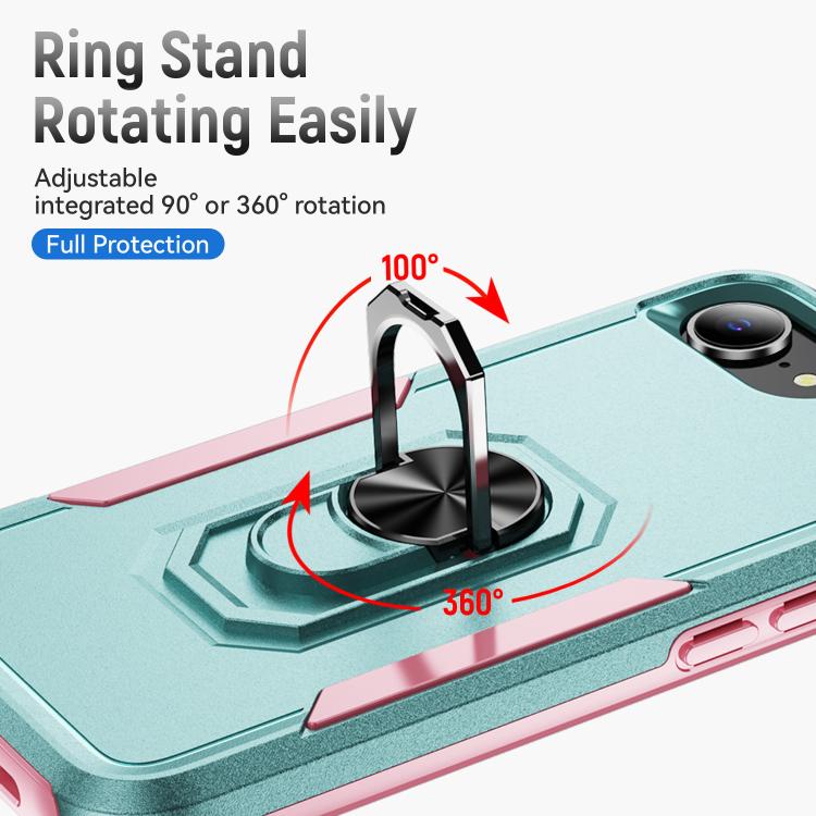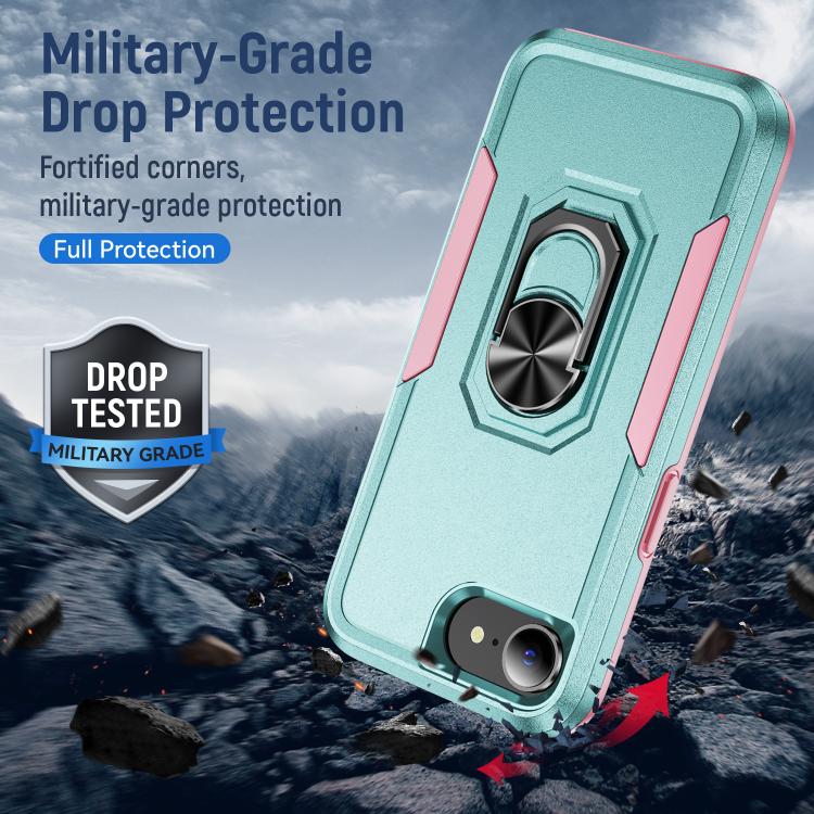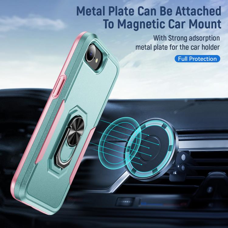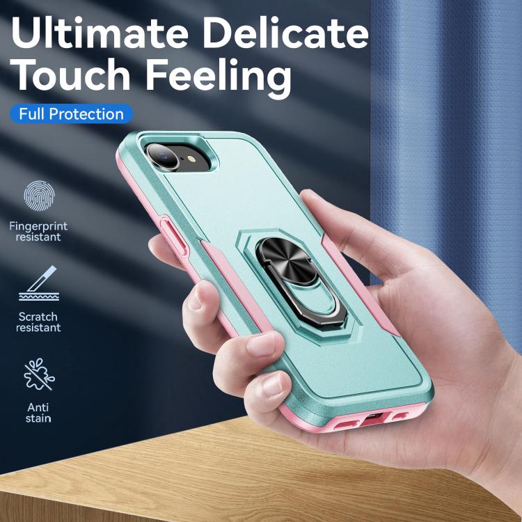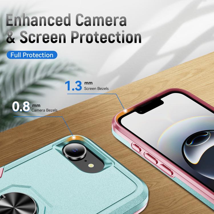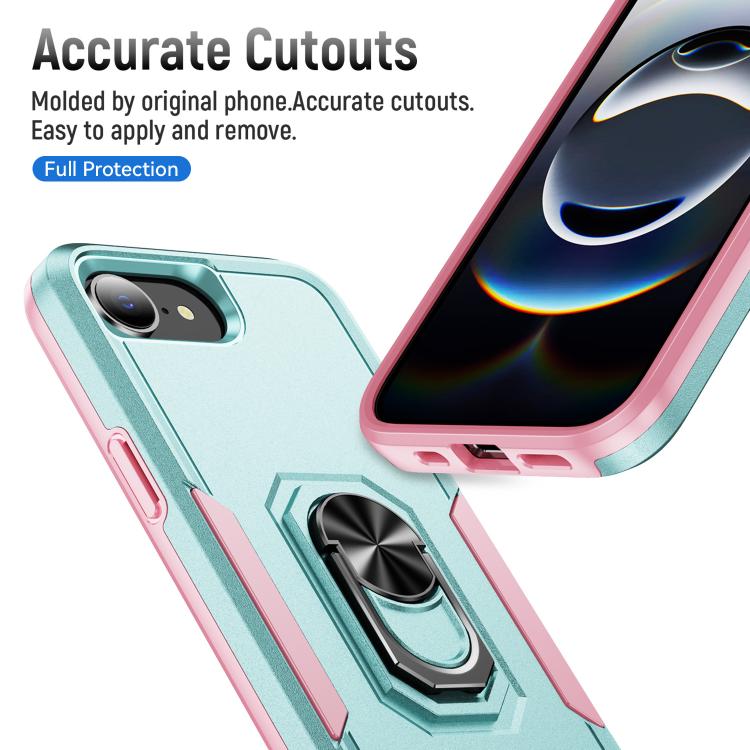 For iPhone 16e Pioneer Armor Heavy Duty PC + TPU Phone Case with Holder(Green+Pink)