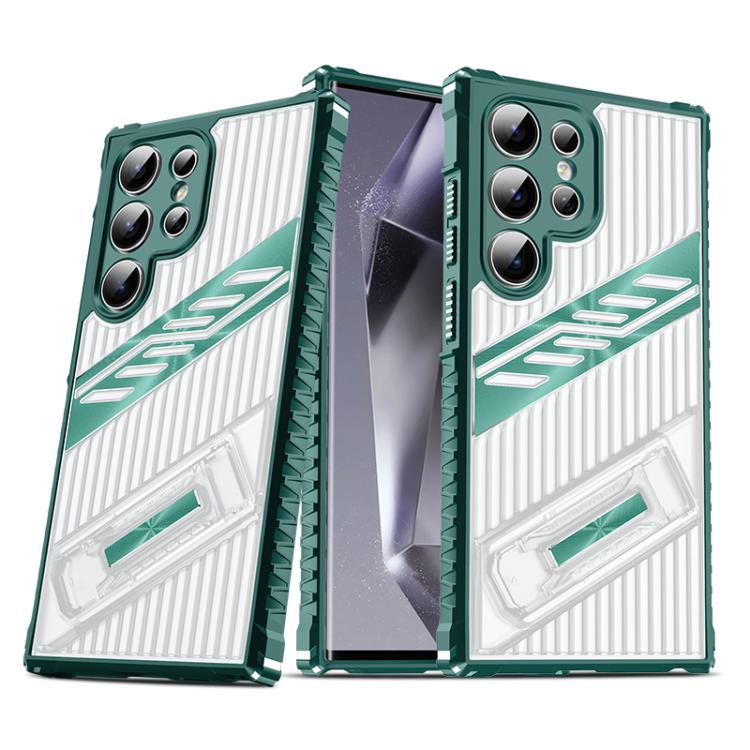 For Samsung Galaxy S25 Ultra 5G Plating Holder PC Hybrid TPU Phone Case(Dark Green)