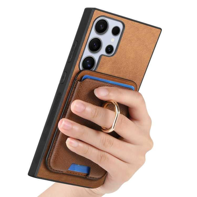For Samsung Galaxy S25 Ultra 5G Retro Cross Leather Ring Vertical Insert Card Bag MagSafe Phone Case(Brown)