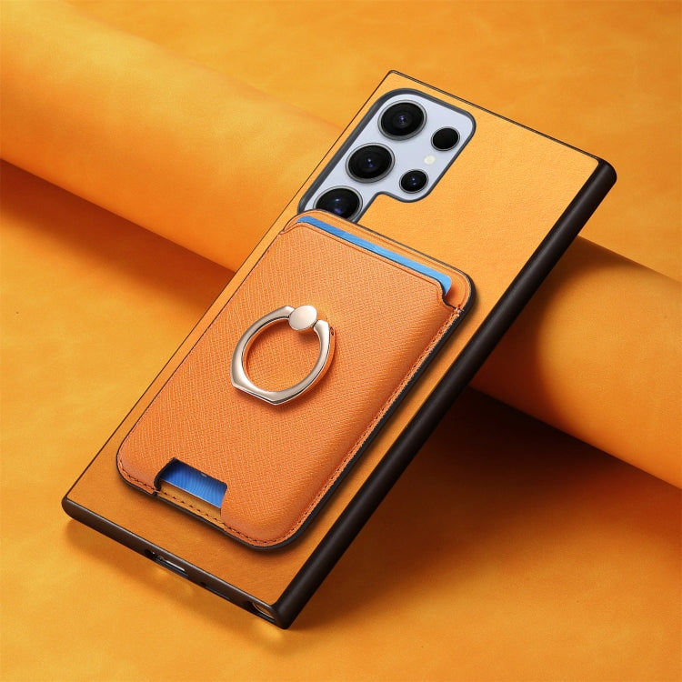 For Samsung Galaxy S25 Ultra 5G Retro Cross Leather Ring Vertical Insert Card Bag MagSafe Phone Case(Yellow)