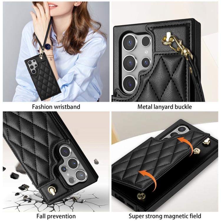 For Samsung Galaxy S25 Ultra 5G Rhombic Dual Buckle Card Slots Phone Case with Lanyard(Black)