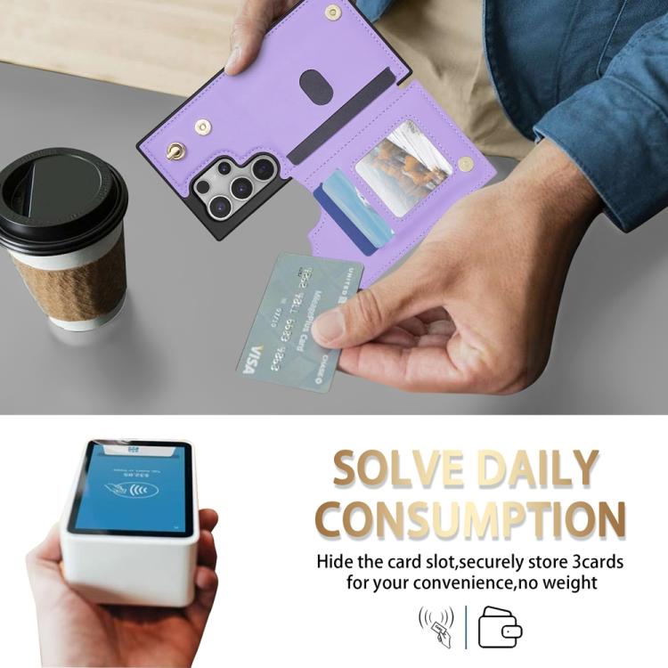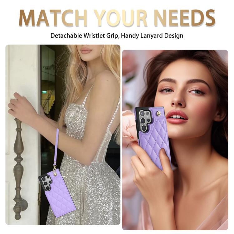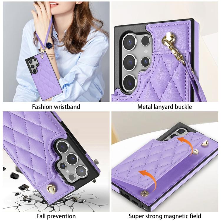 For Samsung Galaxy S25 Ultra 5G Rhombic Dual Buckle Card Slots Phone Case with Lanyard(Purple)