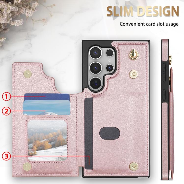 For Samsung Galaxy S25 Ultra 5G Rhombic Dual Buckle Card Slots Phone Case with Lanyard(Rose Gold)