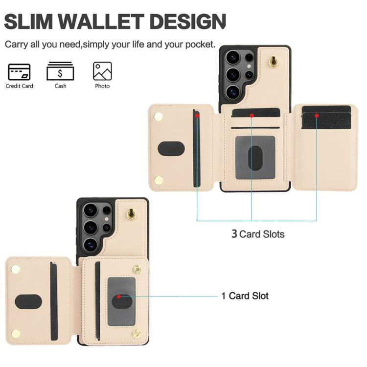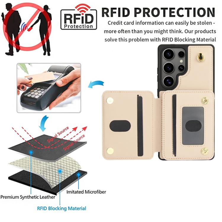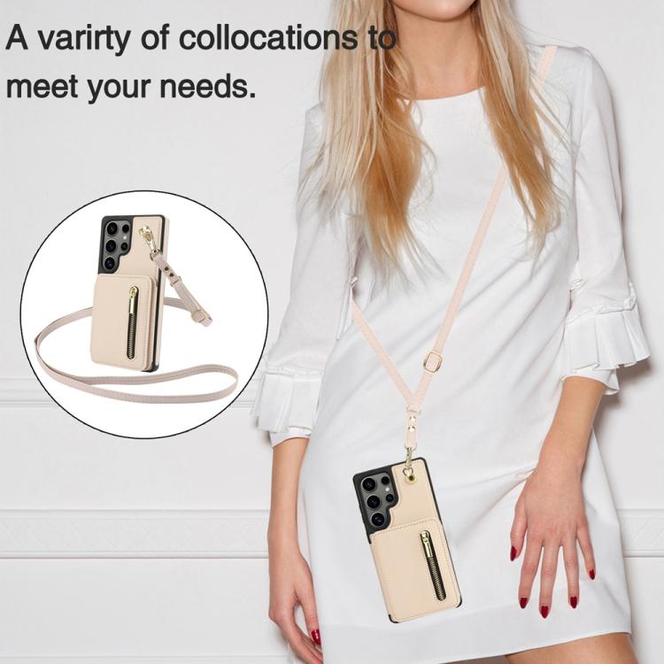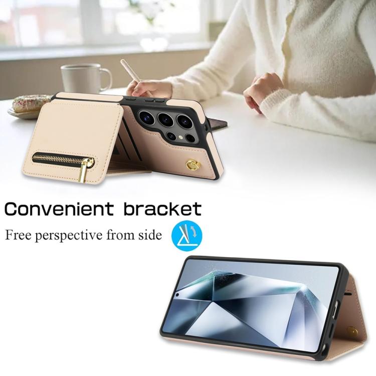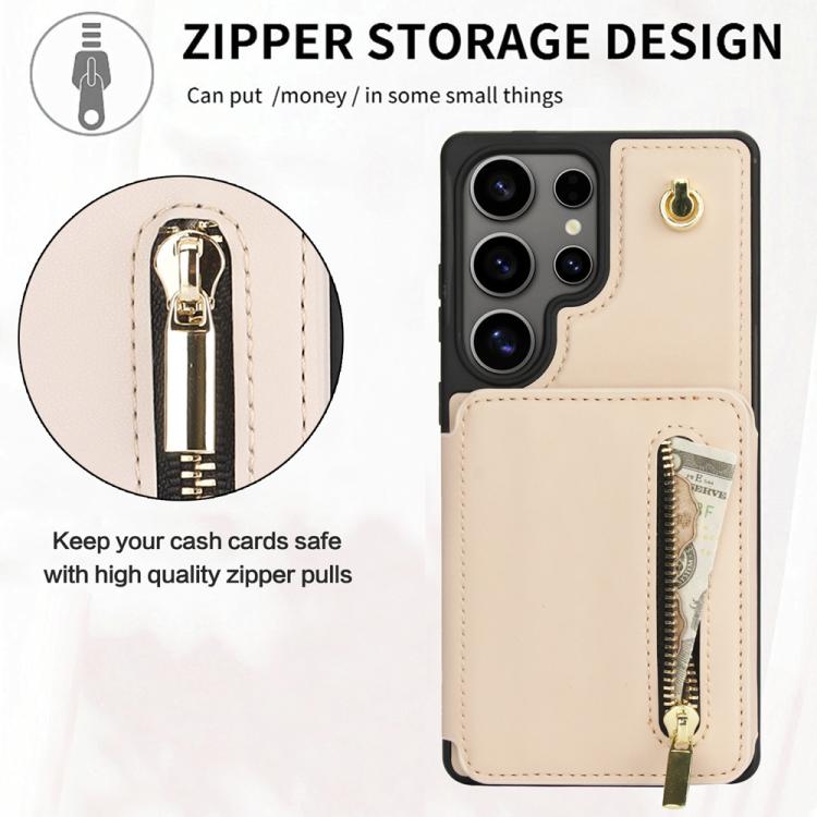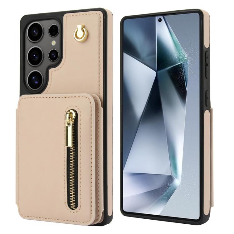 For Samsung Galaxy S25 Ultra 5G YM006 Skin Feel Zipper Card Bag Phone Case with Dual Lanyard(Apricot)