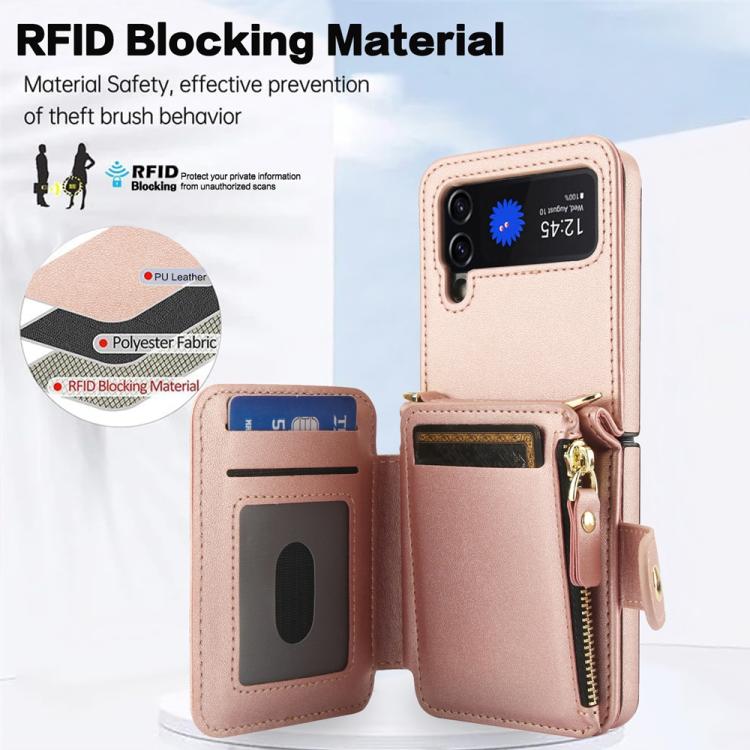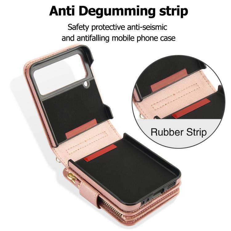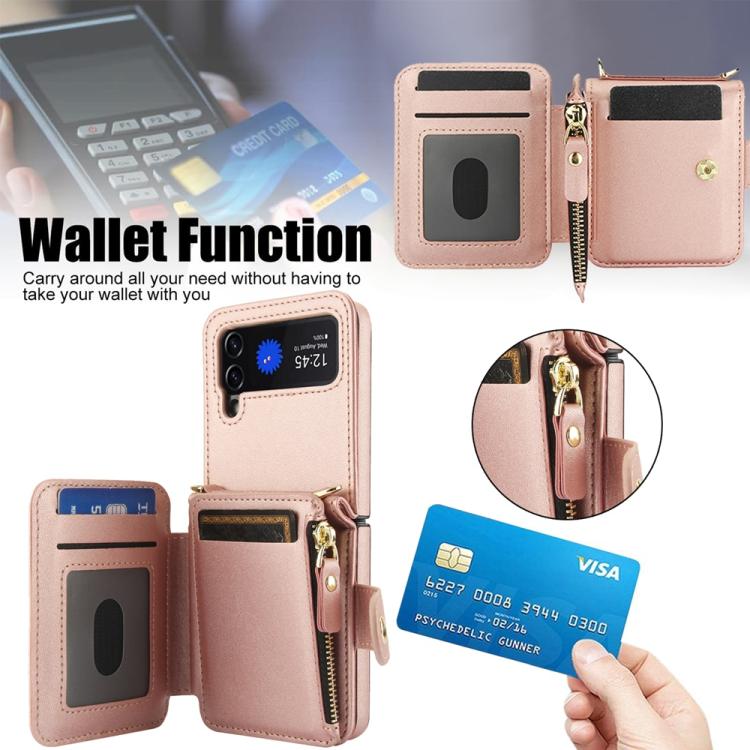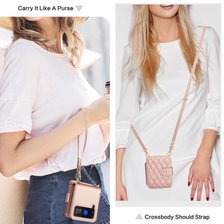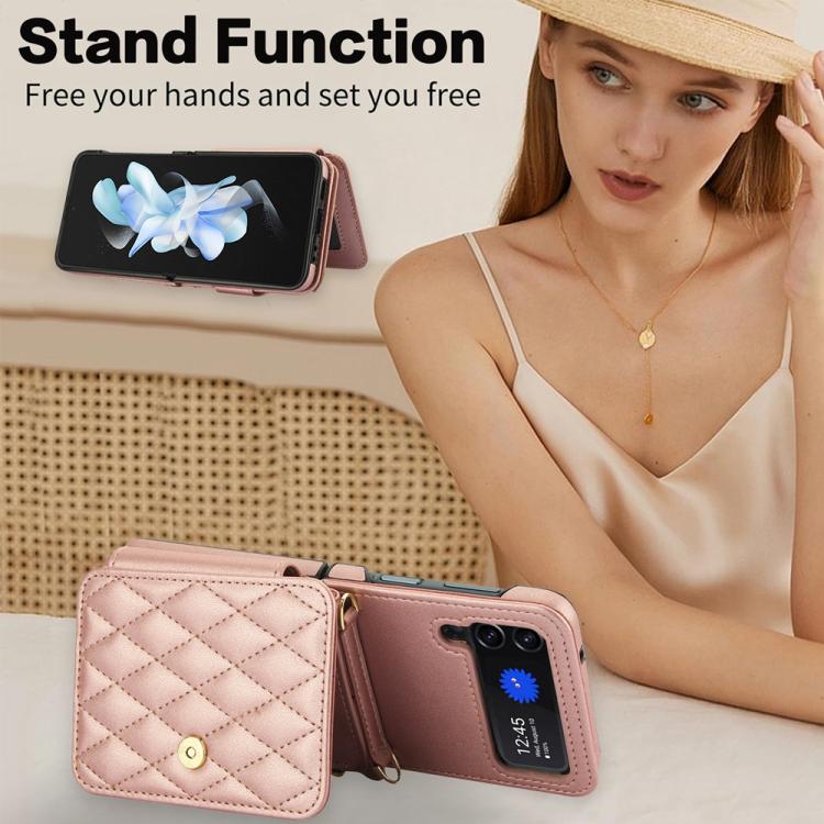 For Samsung Galaxy Z Flip4 Crossbody Rhombus Wallet Bag Folding Phone Case with Lanyard(Rose Gold)