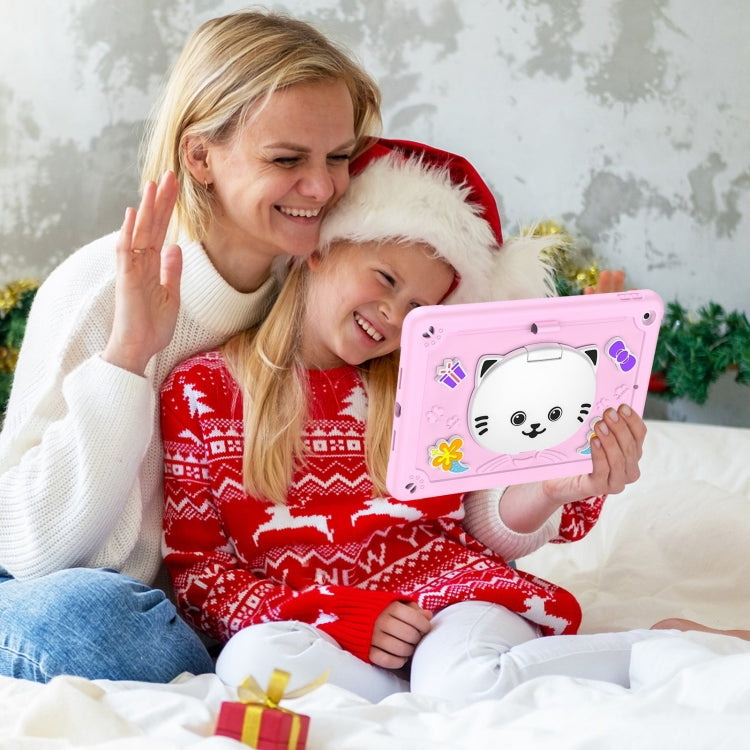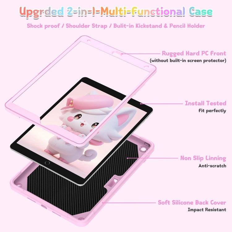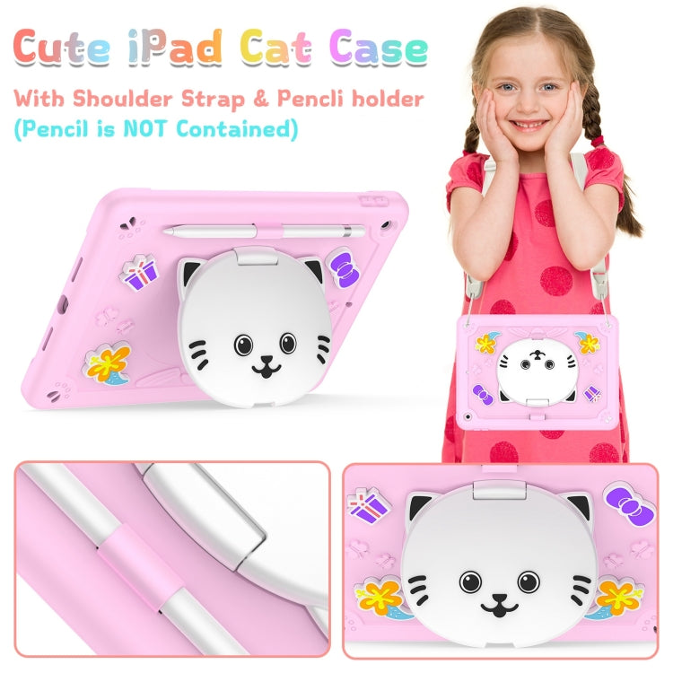 For iPad 10.2 2021 / 2020 / 2019 Cat Holder Silicone Hybrid PC Tablet Case with Strap(Cherry Blossom Pink)