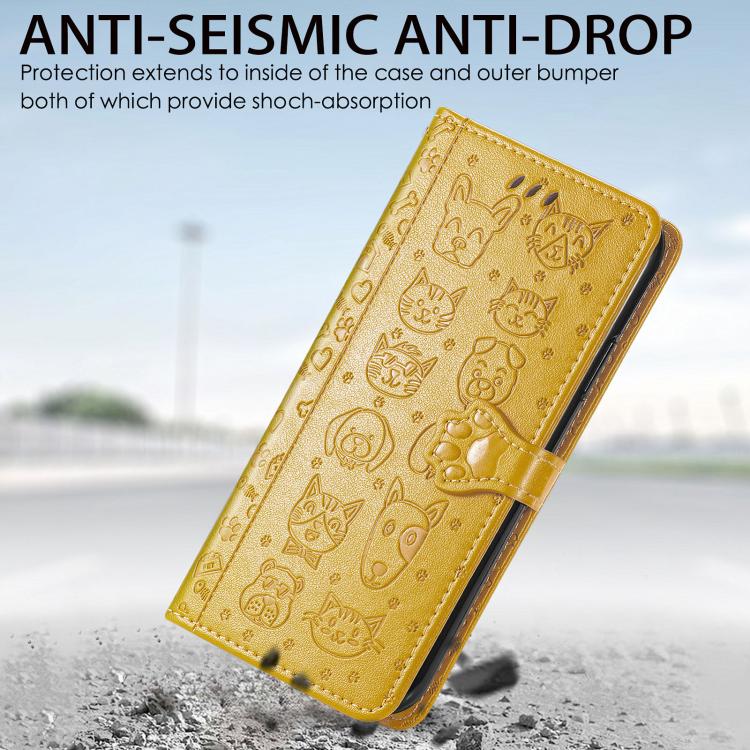 For iPhone 16e Cat and Dog Embossed Leather Phone Case(Yellow)