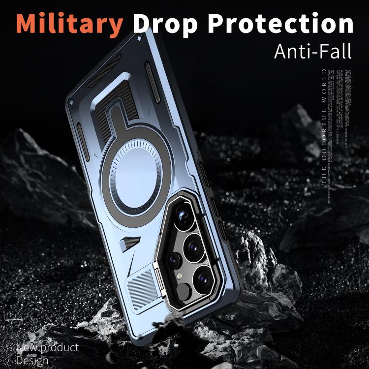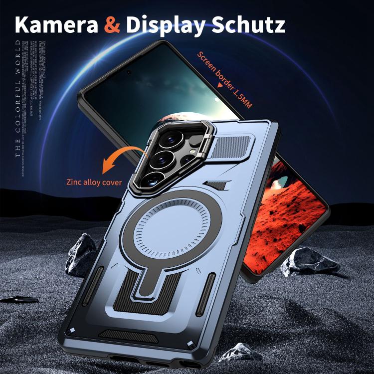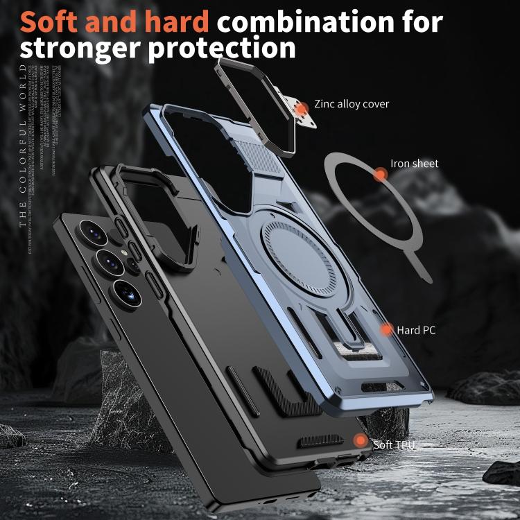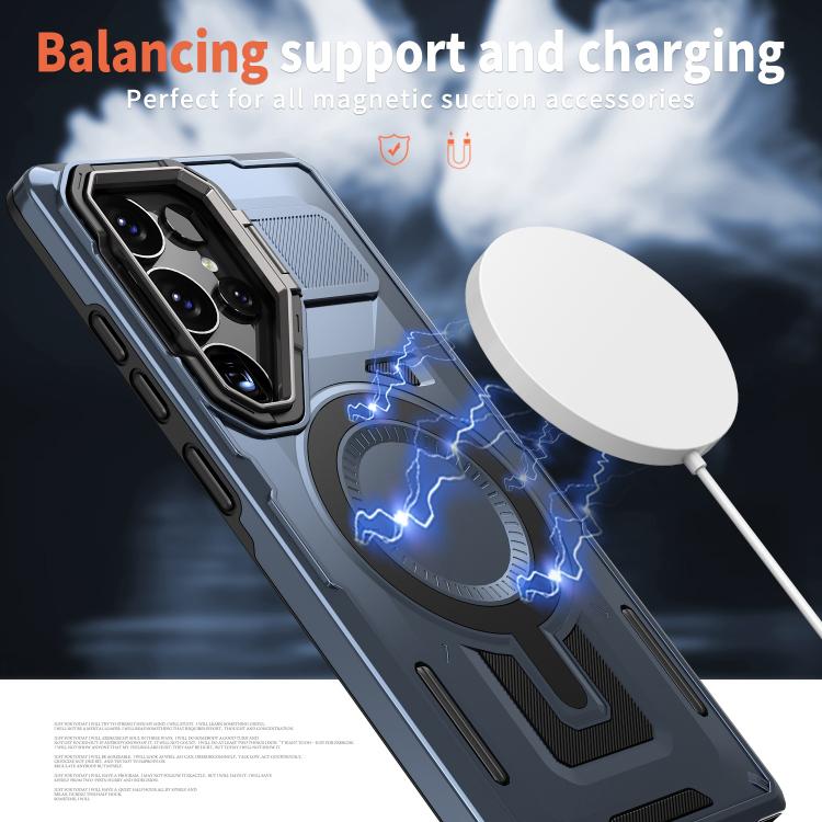 For Samsung Galaxy S25 5G Shield Hollow Frame Holder MagSafe Phone Case(Navy Blue)