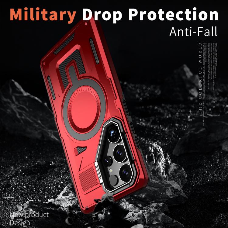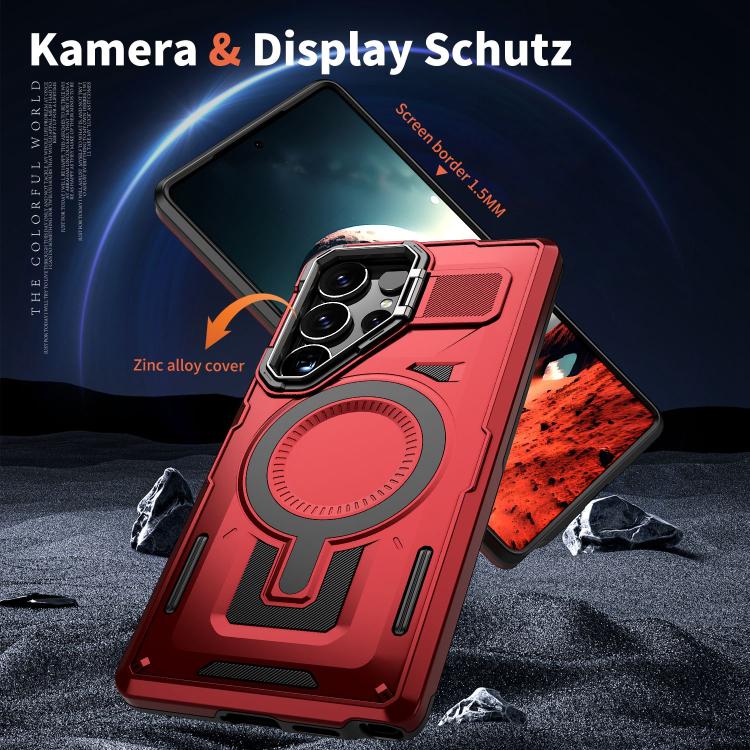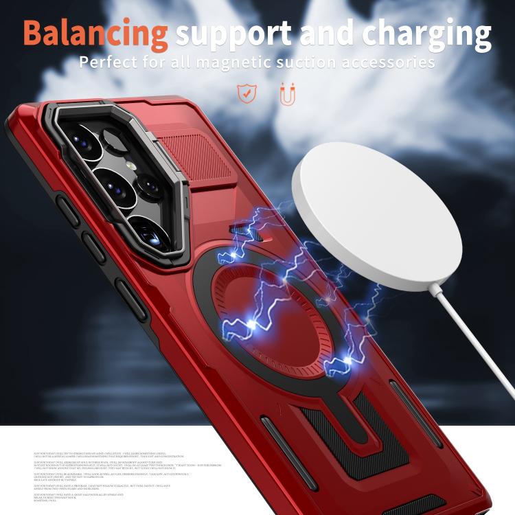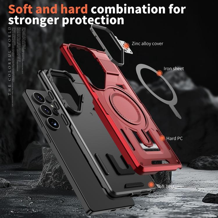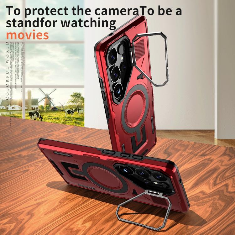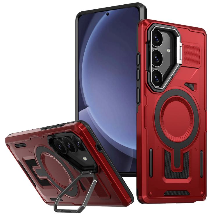 For Samsung Galaxy S25 5G Shield Hollow Frame Holder MagSafe Phone Case(Red)