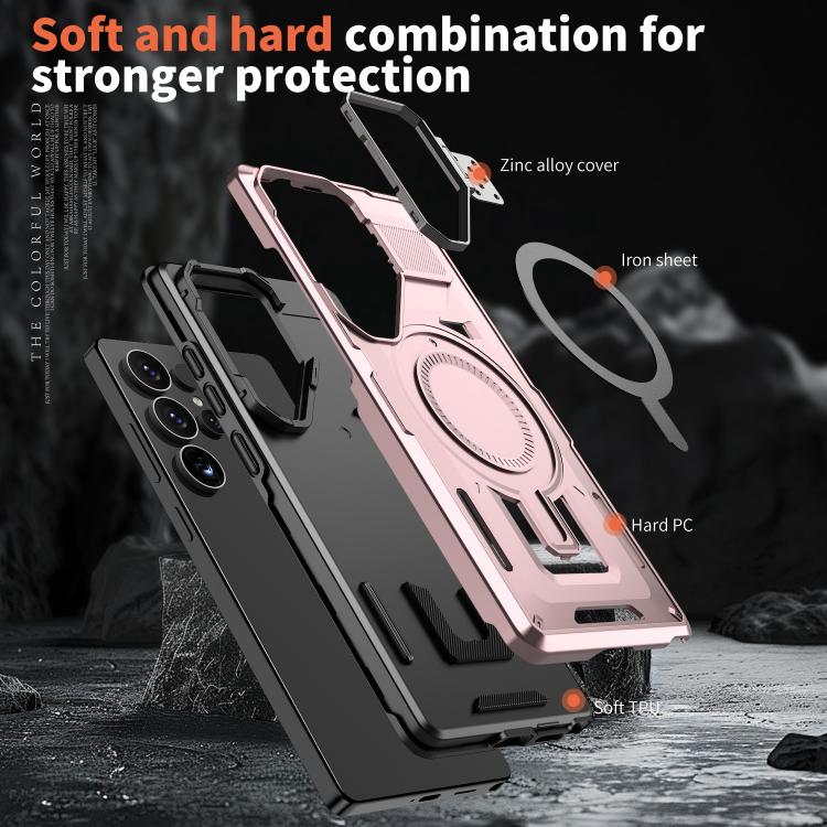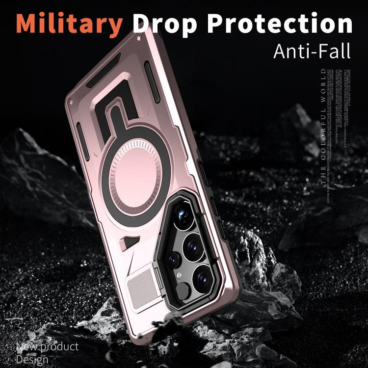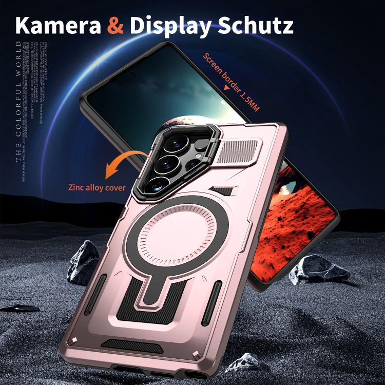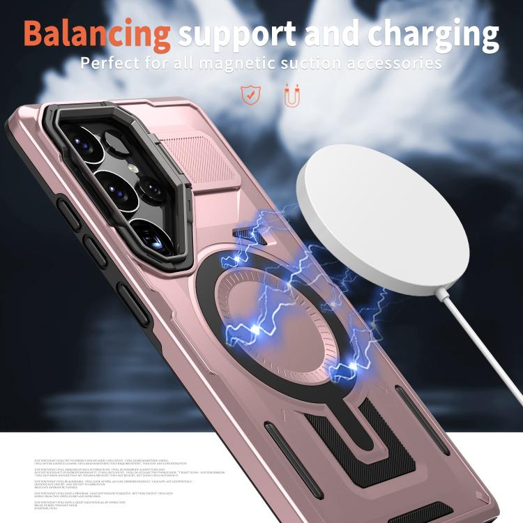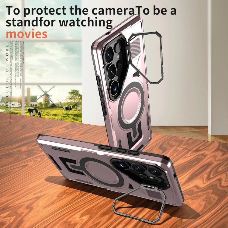 For Samsung Galaxy S25 5G Shield Hollow Frame Holder MagSafe Phone Case(Rose Gold)