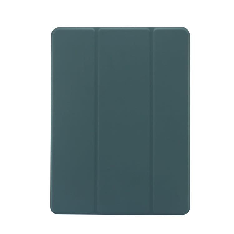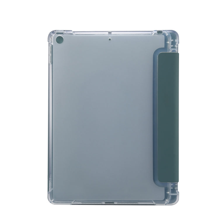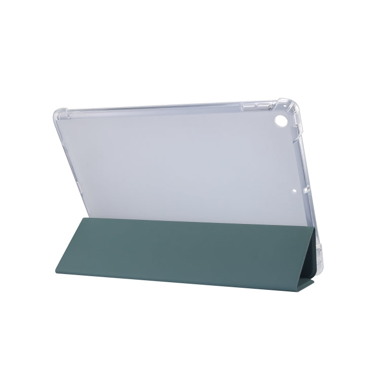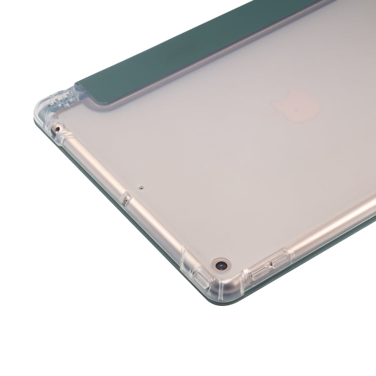 For iPad 10.2 2021 / 2020 / 2019 3-folding Electric Pressed Skin Texture Horizontal Flip Shockproof Transparent TPU + PU Leather Case with Holder & Pen Slot & Sleep / Wake-up Function(Dark Green)