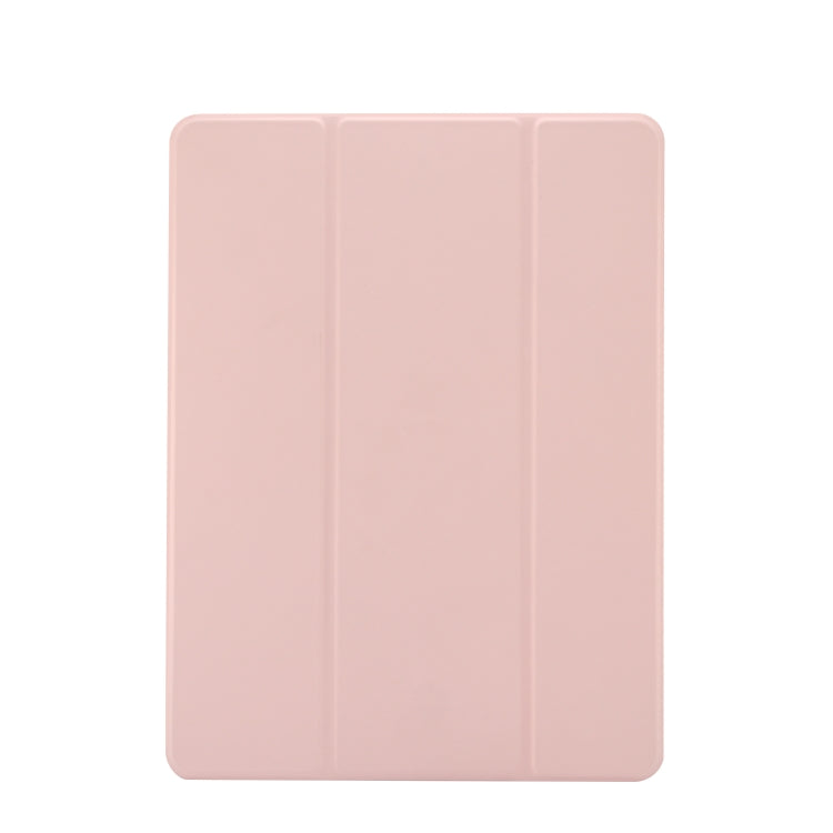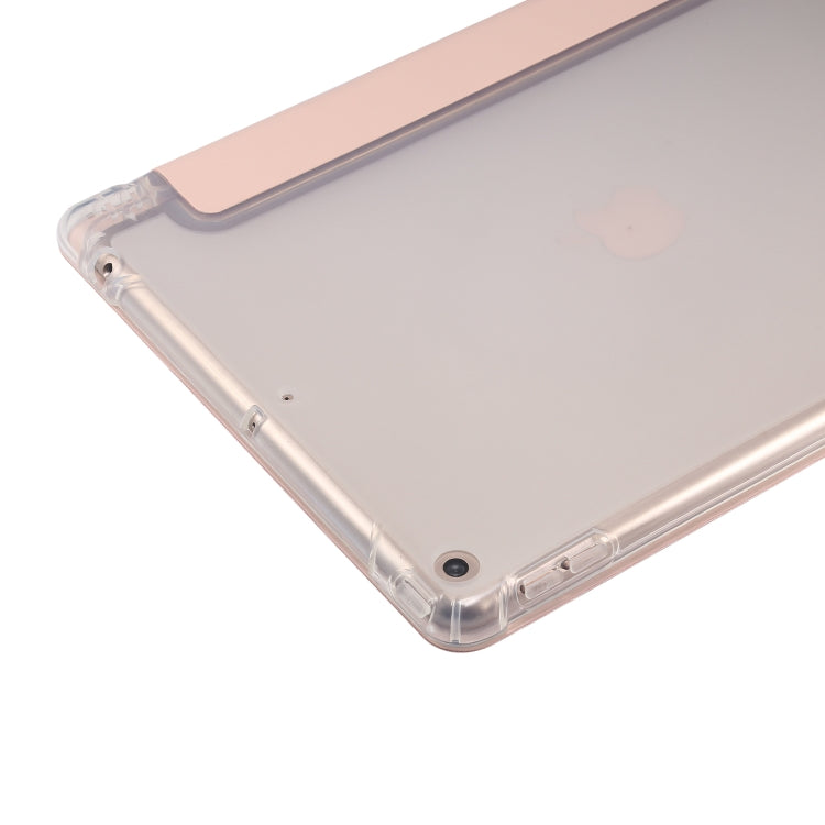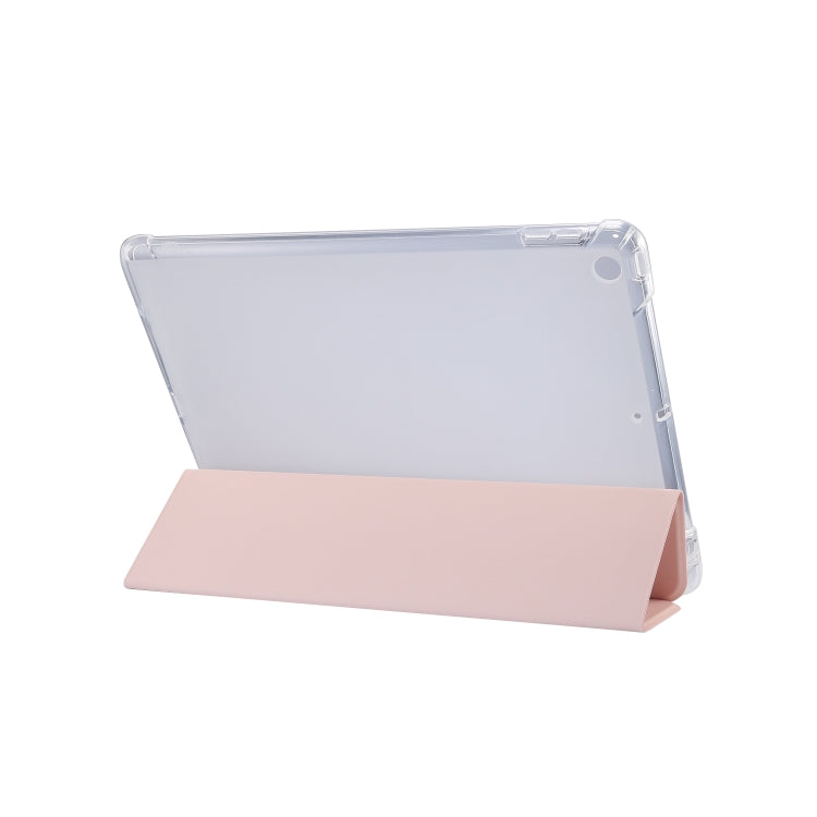 For iPad 10.2 2021 / 2020 / 2019 3-folding Electric Pressed Skin Texture Horizontal Flip Shockproof Transparent TPU + PU Leather Case with Holder & Pen Slot & Sleep / Wake-up Function(Light Pink)