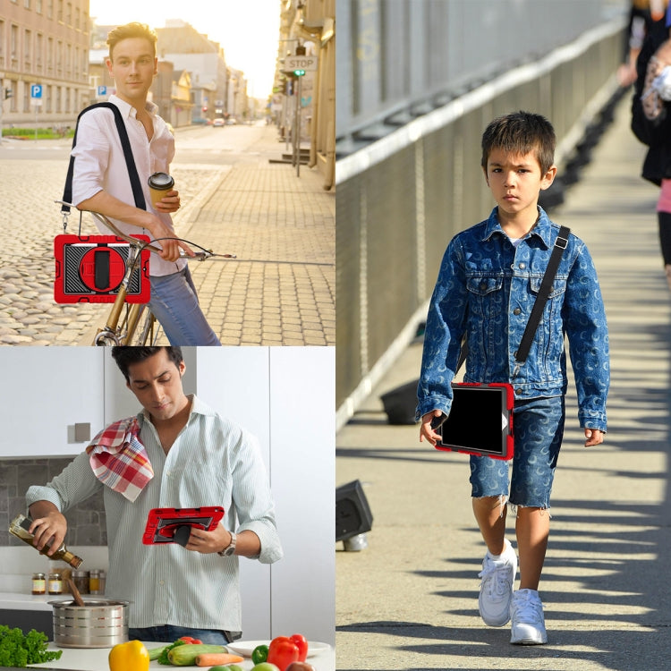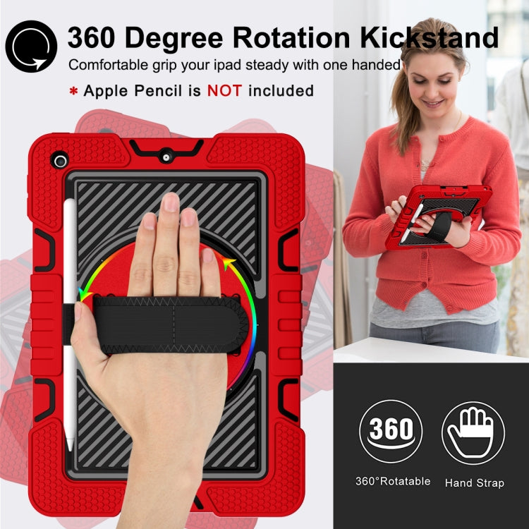 For iPad 10.2 2021 / 2020 / 2019 360 Degree Rotation Contrast Color Shockproof Silicone + PC Case with Holder & Hand Grip Strap & Shoulder Strap (Red+Black)