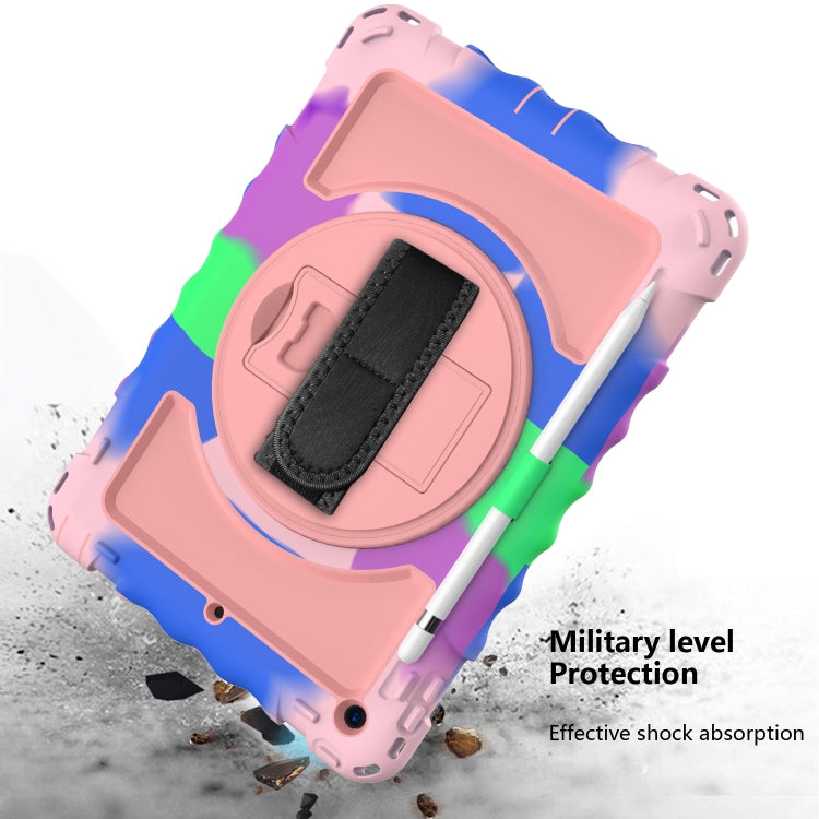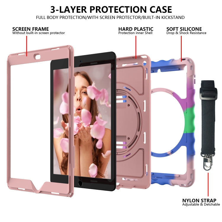 For iPad 10.2 360 Degree Rotating Case with Pencil Holder, Kickstand Shockproof Heavy Duty with Shoulder Strap,Hand Strap(Colorful+Rose Gold)