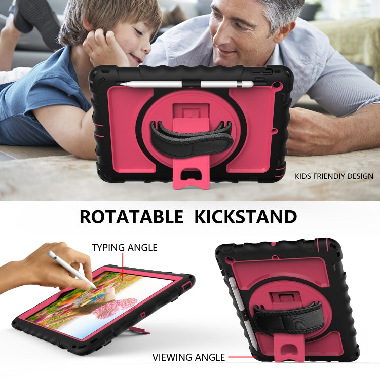 For iPad 10.2 360 Degree Rotating Case with Pencil Holder, Kickstand Shockproof Heavy Duty with Shoulder Strap,Hand Strap(Hot Pink)