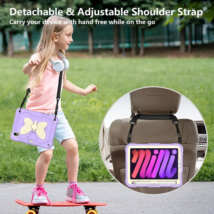 For iPad mini 6 / mini 2024 Beige PC + Silicone Anti-drop Protective Tablet Case with Butterfly Shape Holder & Pen Slot(Beige + Light Purple)