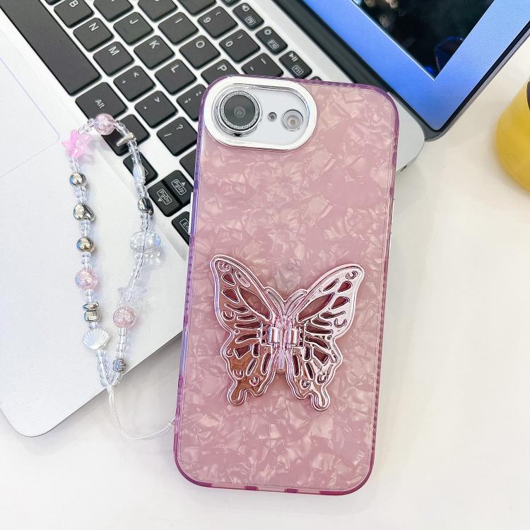 For iPhone 16e Plating Glitter Lens Film Texture Butterfly Holder Wristband Phone Case(Pink Shell Pattern)