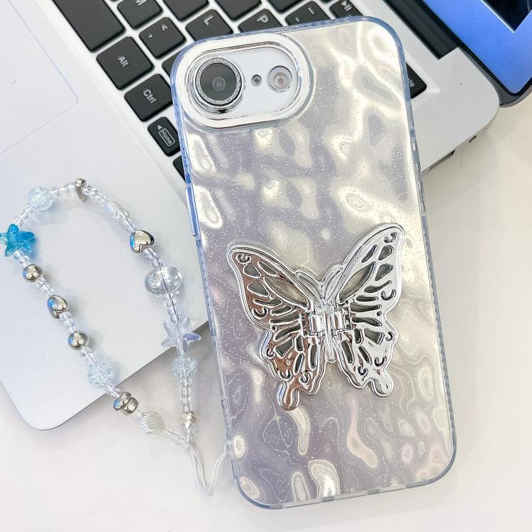 For iPhone 16e Plating Glitter Lens Film Texture Butterfly Holder Wristband Phone Case(White Wrinkles)