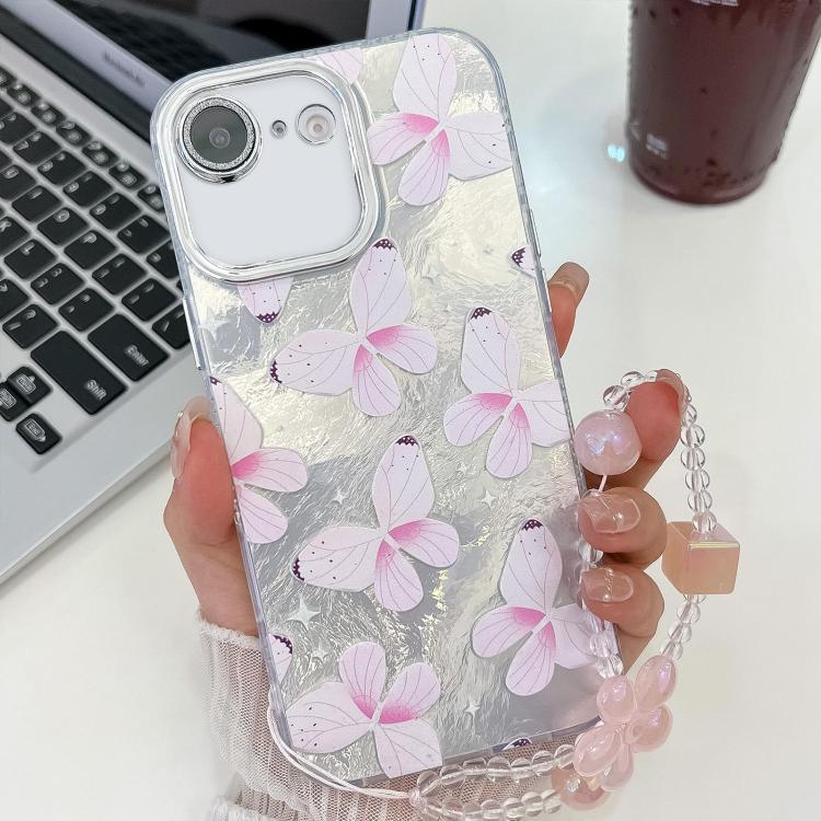 For iPhone 16e Plating Texture Butterfly Wristband TPU Phone Case with Glitter Lens Film(Pink Butterflies HU5)