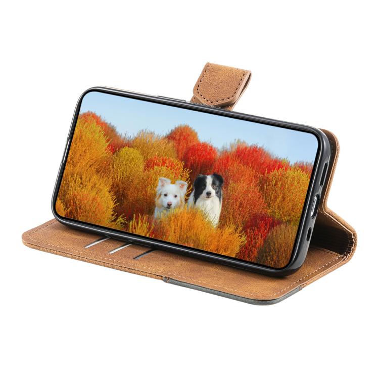 For iPhone 16e TTUDRCH Embossed Line Splicing Leather Phone Case(Brown)