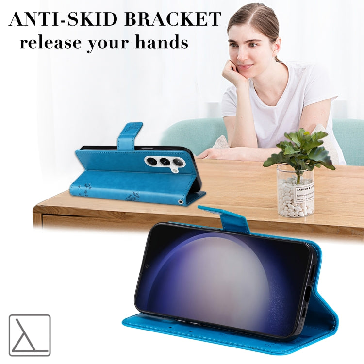 For Samsung Galaxy S25 / S24 5G Tree & Cat Embossed Pattern Flip Leather Phone Case(Blue)