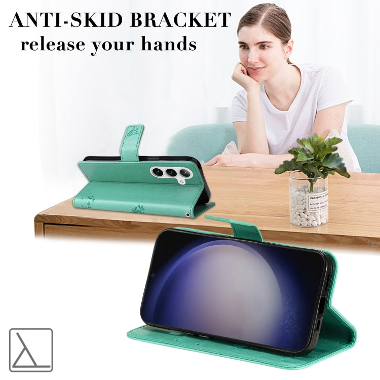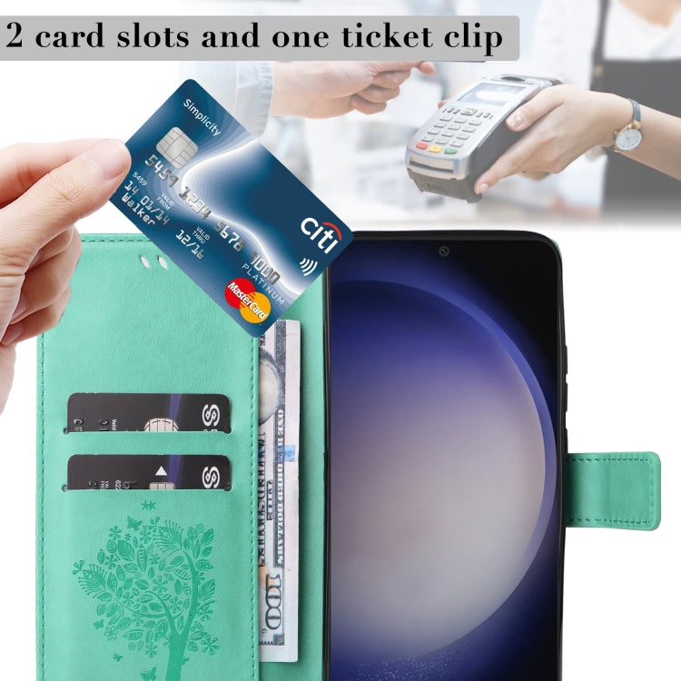 For Samsung Galaxy S25 / S24 5G Tree & Cat Embossed Pattern Flip Leather Phone Case(Green)
