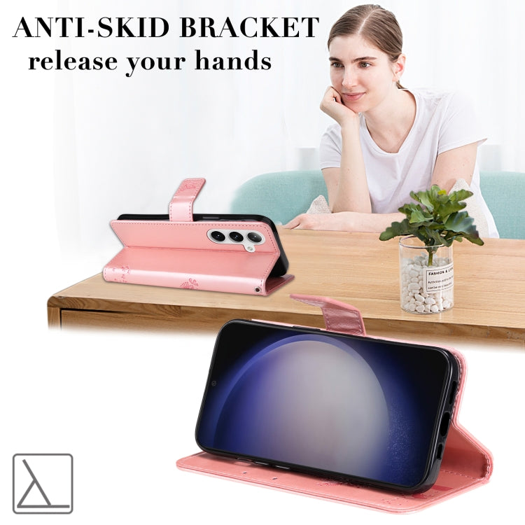 For Samsung Galaxy S25 / S24 5G Tree & Cat Embossed Pattern Flip Leather Phone Case(Rose Gold)