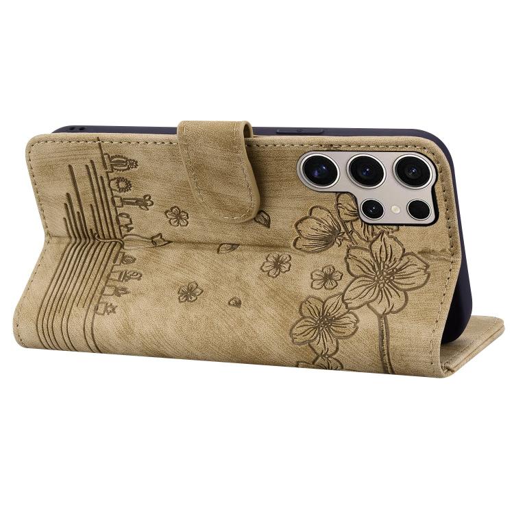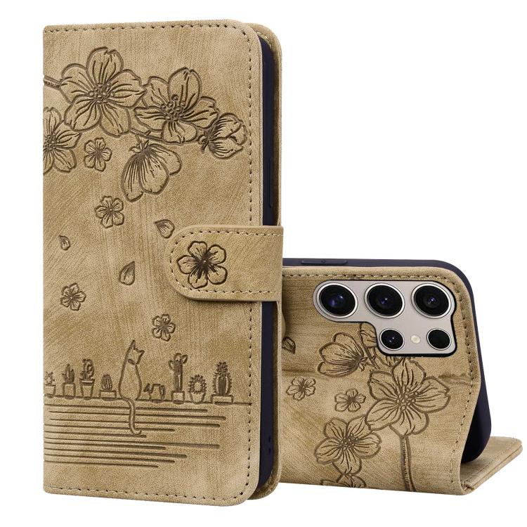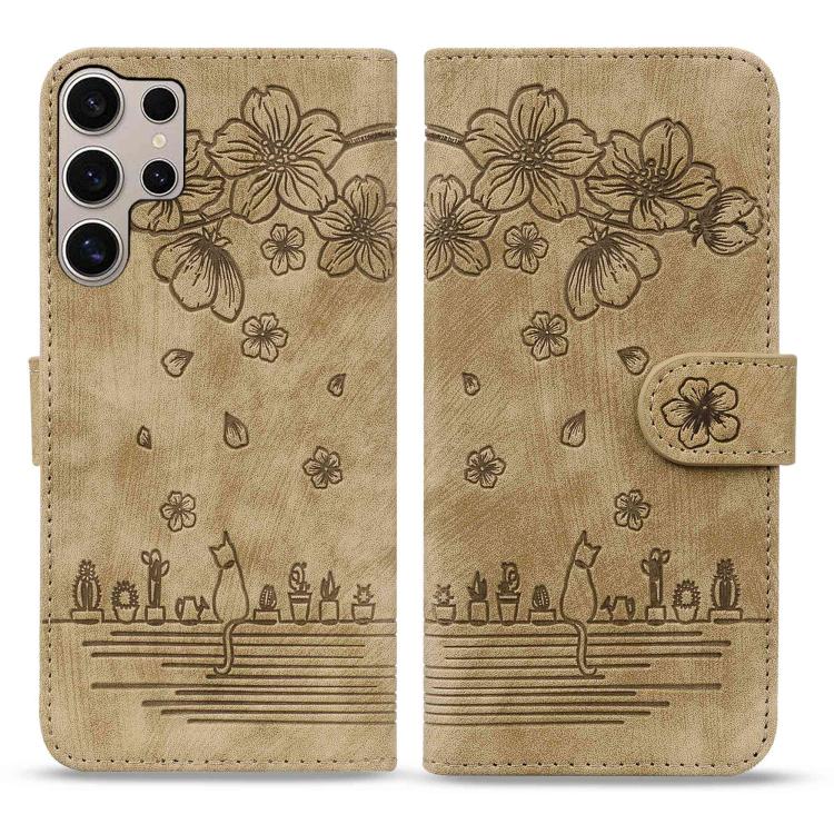 For Samsung Galaxy S25 Ultra 5G Cartoon Sakura Cat Embossed Leather Phone Case(Brown)