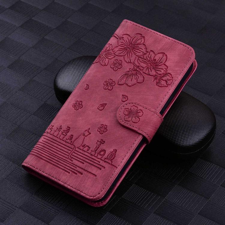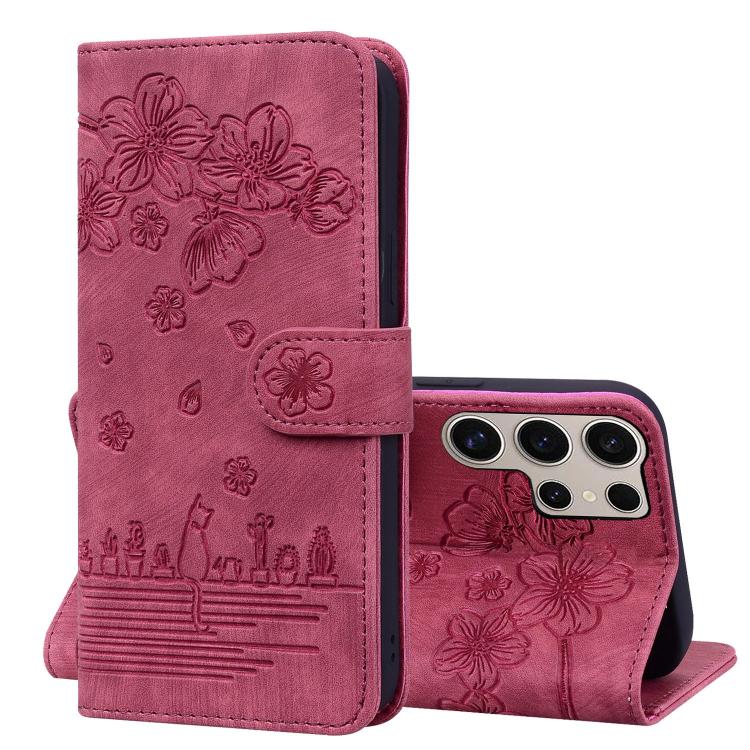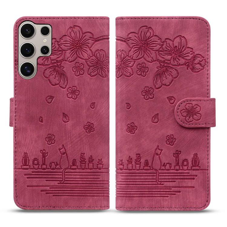 For Samsung Galaxy S25 Ultra 5G Cartoon Sakura Cat Embossed Leather Phone Case(Wine Red)