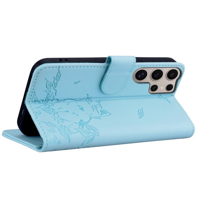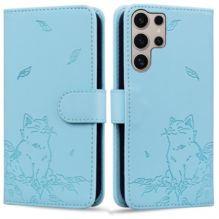 For Samsung Galaxy S25 Ultra 5G Cute Cat Embossed Leather Phone Case(Sky Blue)