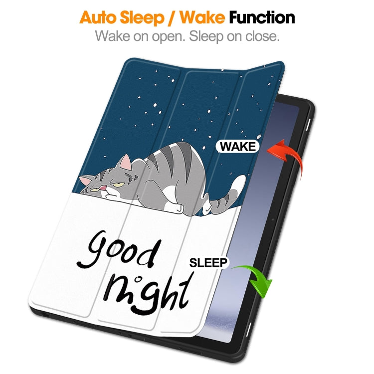 For Samsung Galaxy Tab A9+ Custer Painted 3-Fold Holder Smart TPU Leather Tablet Case with Pen Tray(Lazy Cat)