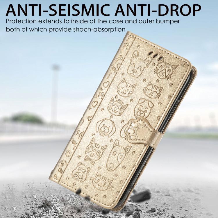 For iPhone 16e Cat and Dog Embossed Leather Phone Case(Gold)