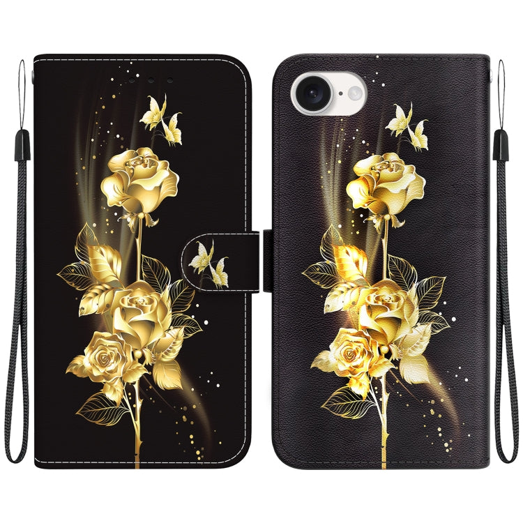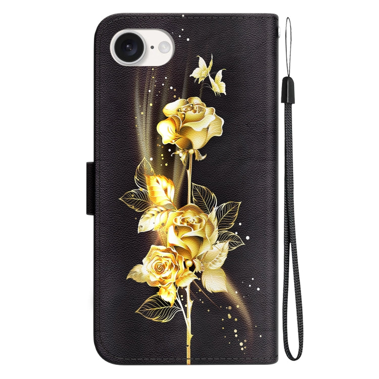 For iPhone 16e Crystal Texture Colored Drawing Leather Phone Case(Gold Butterfly Rose)