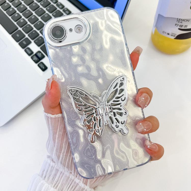 For iPhone 16e Plating Glitter Texture Butterfly Holder TPU Phone Case with Lens Film(White Wrinkles)